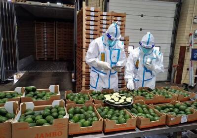 圖為:關員對肯尼亞進口鮮食牛油果進行查驗作業 關悅/攝