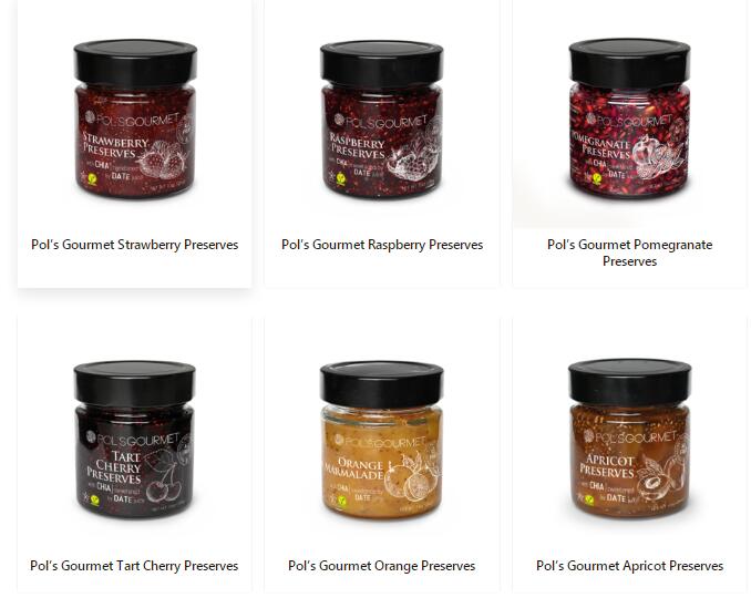 選用新鮮水果制作,采用濃縮棗汁加糖,我們用奇亞籽代替果膠,多種口味(杏、草莓、無花果、橙子、酸櫻桃、石榴、木瓜和李子)。
