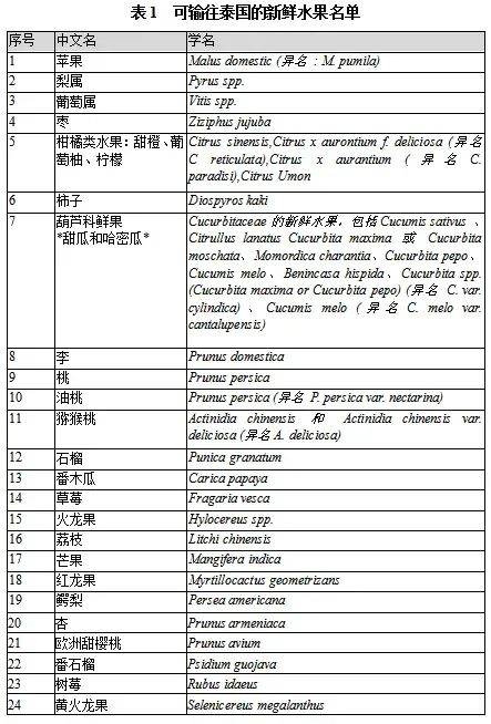我國可向泰國出口的水果種類是指泰國農業部網站(www.doa.go.th)所列出的新鮮水果,目前是24種類的水果,見表1,其中已經與泰國農業部交換果園和包裝廠注冊信息的水果包括蘋果、鮮梨、葡萄、棗、柑橘類水果(包括橙子、柚子、橘子、檸檬)、柿子、甜瓜和哈密、李子、桃(包括油桃)、獼猴桃、石榴12種水果。