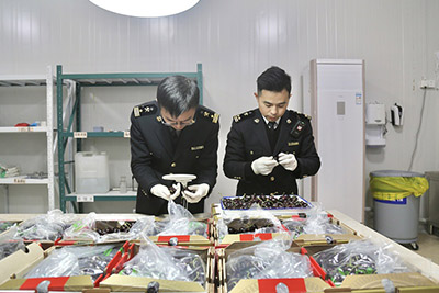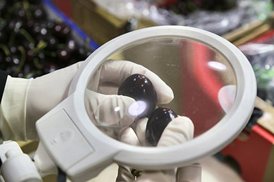 圖為:關員對進境車厘子進行查驗? 胡波波/攝