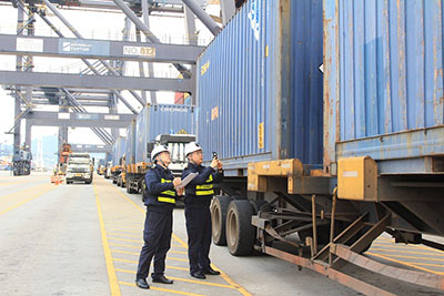 圖為:關員在泊位邊對等待吊裝上船的貨柜開展監管 李硯偉/攝