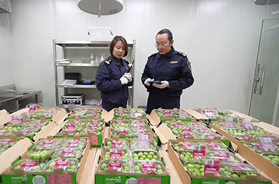 圖為:關員對進口軟棗獼猴桃進行查驗 張祖愷/攝