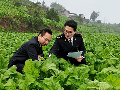 圖為:關員實地考核新申請備案的出口榨菜原料種植場