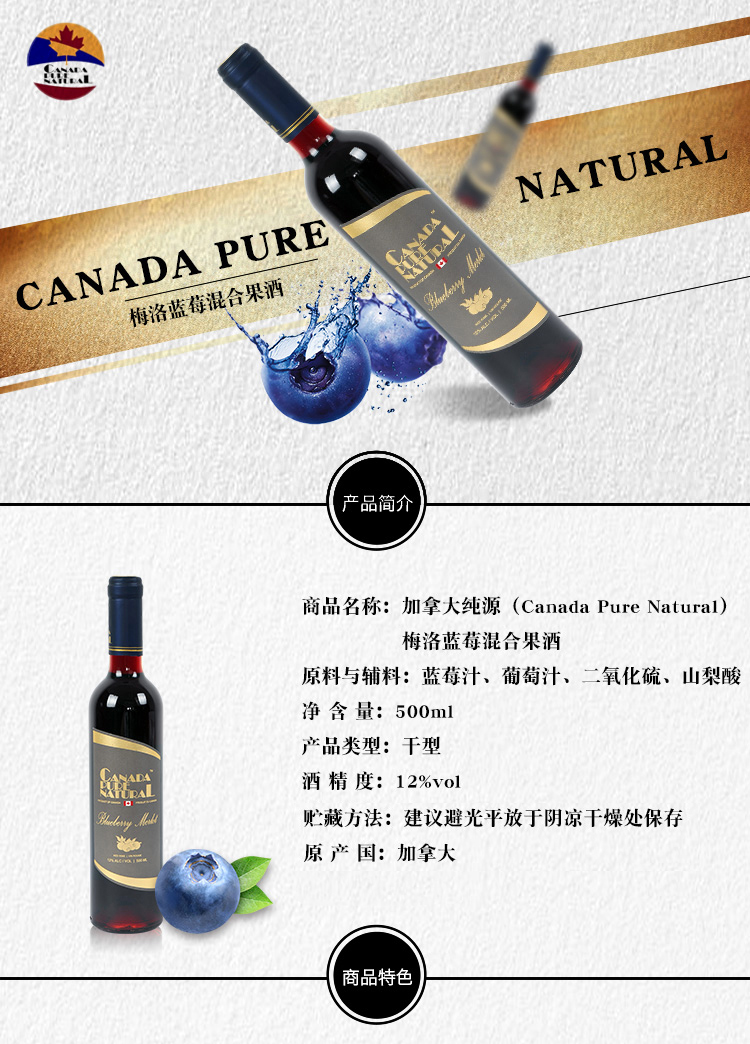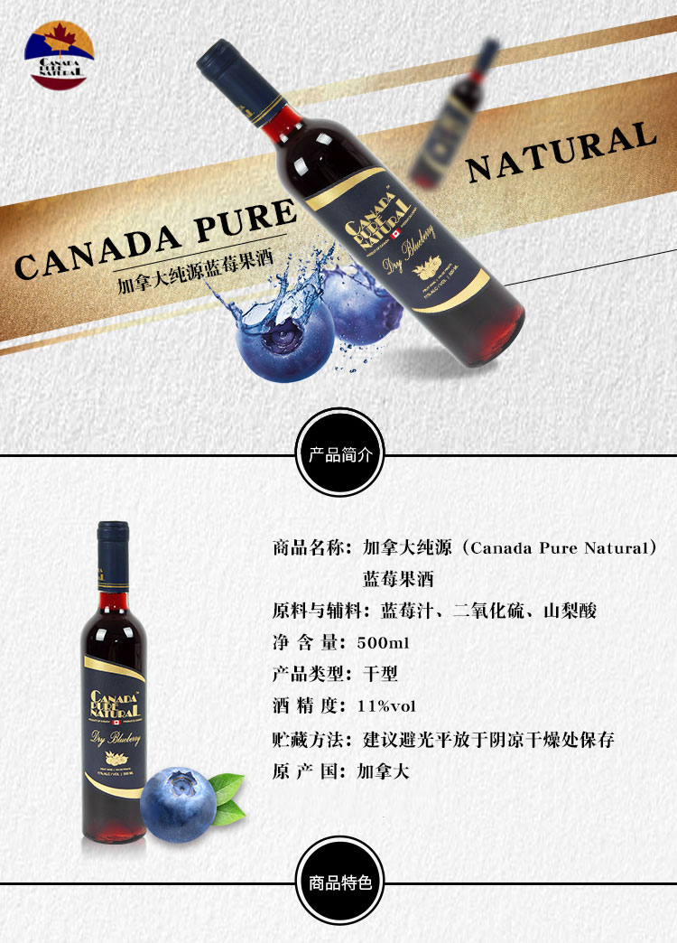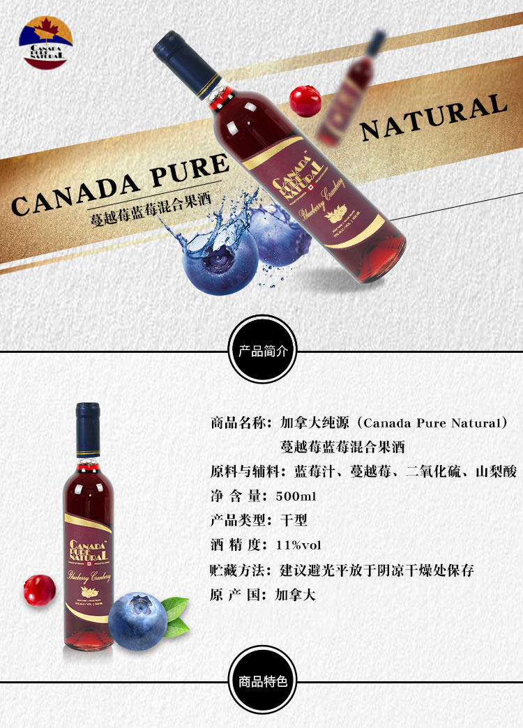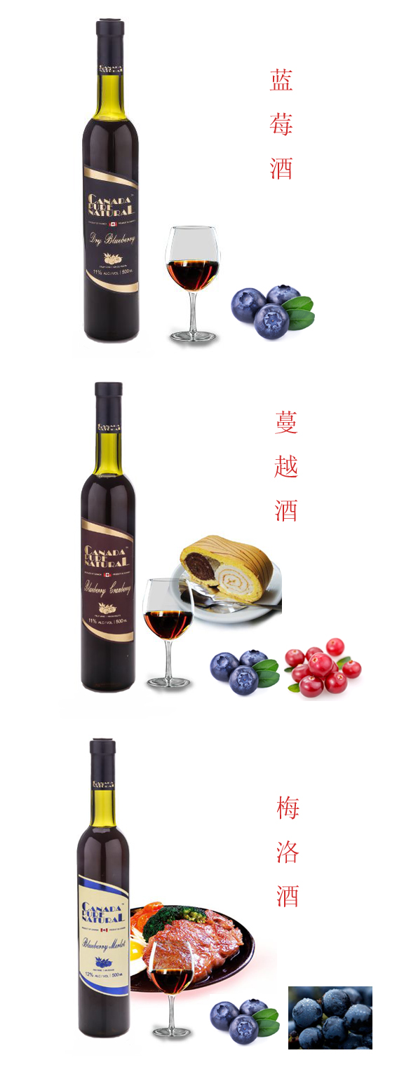 采用加拿大本地特色水果,藍(lán)莓,蔓越莓,梅洛釀制而成,
