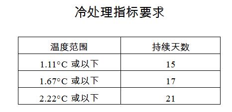 10.1 出口前冷處理的溫度、持續(xù)時(shí)間及包裝廠或處理設(shè)施名稱或編號(hào),必須寫進(jìn)植物檢疫證書處理欄內(nèi)。