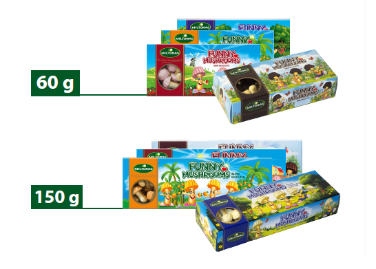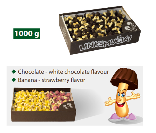 我們是立陶宛一家食品企業,主要生產的巧克力餅干,蘑菇狀造型,奇趣又美味,總共有五種口味,巧克力味,白巧克力味,草莓味,香蕉味和焦糖味。多種產品規格,1 kg, 500 g, 170 g, 150 g, 100 g和60 g。