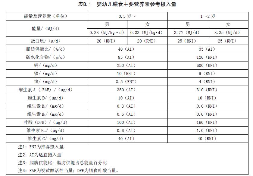 嬰幼兒每人每天能量和主要營(yíng)養(yǎng)素供給量應(yīng)符合表B.1的規(guī)定。