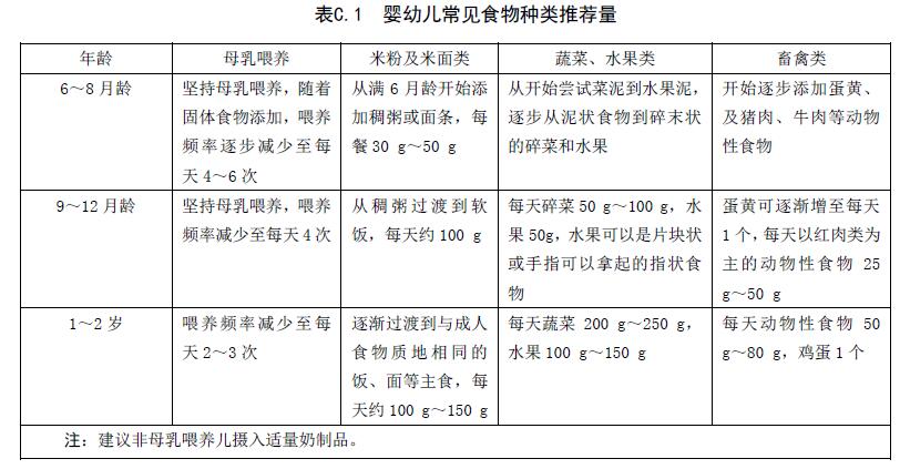不同年齡段嬰幼兒各類(lèi)食物推薦攝入量見(jiàn)表C.1。