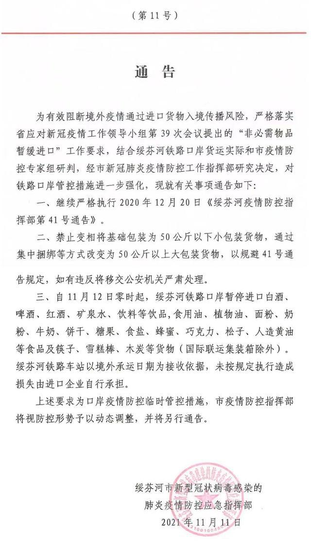 據央視新聞客戶端消息,11月11日,黑龍江綏芬河疫情防控指揮部發布通告,自11月12日零時起,綏芬河鐵路口岸暫停進口白酒、啤酒、紅酒、礦泉水、飲料等飲品,食用油、植物油、面粉、奶粉、牛奶、餅干、糖果、食鹽、蜂蜜、巧克力、松子、人造黃油等食品及筷子、雪糕棒、木炭等貨物(國際聯運集裝箱除外)。