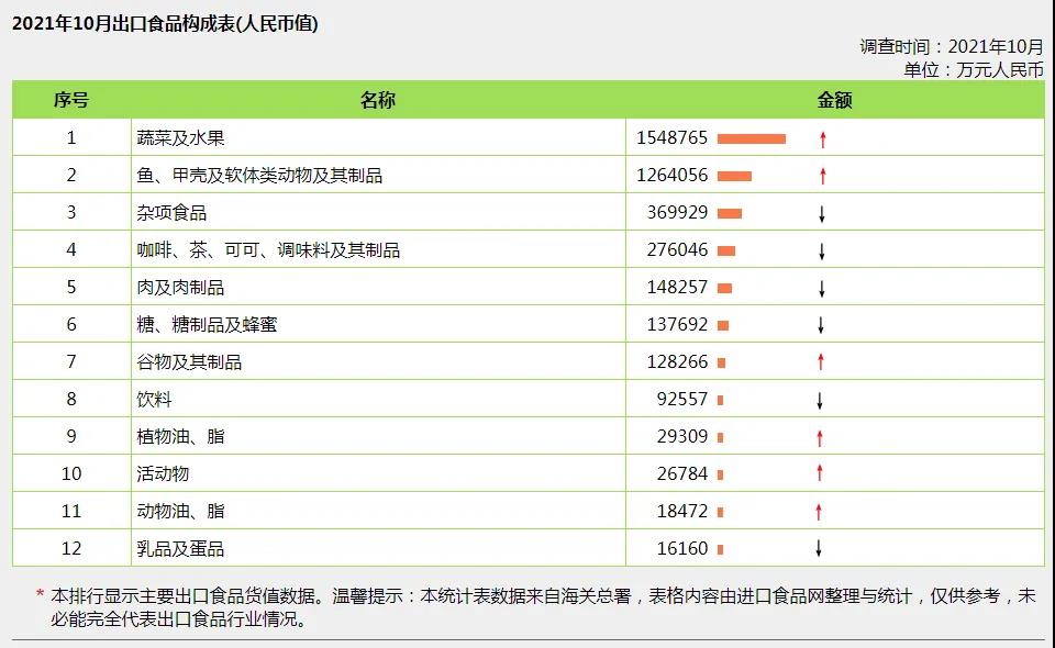2021年10月出口食品構(gòu)成表中,相比2021年9月各類產(chǎn)品,前三名依然是蔬菜及水果;魚、甲殼及軟體類動物及其制品;雜項食品。排名最后兩位略有變化。