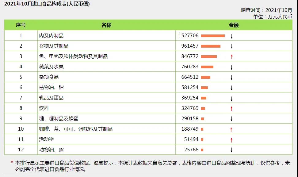 (2021年9月各類產(chǎn)品排名分別為肉及肉制品;谷物及其制品;蔬菜及水果;魚、甲殼及軟體類動物及其制品;植物油、脂;雜項食品;乳品及蛋品;飲料;糖、糖制品及蜂蜜;咖啡、茶、可可、調(diào)味料及其制品;活動物;動物油、脂。2021年10月則為肉及肉制品;谷物及其制品;魚、甲殼及軟體類動物及其制品;蔬菜及水果;雜項食品;植物油、脂;乳品及蛋品;飲料;糖、糖制品及蜂蜜;咖啡、茶、可可、調(diào)味料及其制品;活動物;動物油、脂)