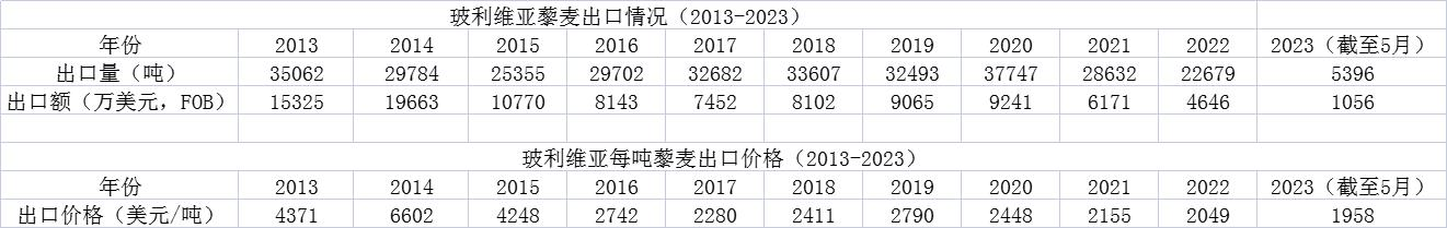 玻《理性報》5月22日報道,由于玻利維亞藜麥(Quinua)產量低、運費高,與其他國家相比競爭力低下,自2020年以來出口量及出口價格逐年下降。2022年,玻藜麥出口量2.27萬噸,同比下降20.8%,出口額4650萬美元,同比下降24.7%;2021年玻藜麥出口量和出口額分別同比下降24.1%和33.2%。藜麥出口價格由6602美元/噸(2014年)跌至1958美元/噸(2023年5月)。