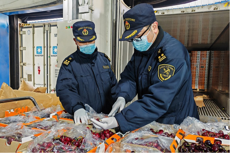 圖為:海關關員正在現場查驗進口新鮮車厘子 劉鑫赫/攝